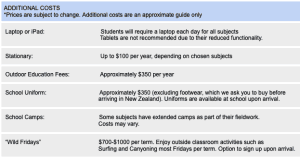 - Outdoor Education Activities: Abseiling, Tramping, Climbing, Mountain biking, Snorkelling and Kayaking (Levels 1 & 2 approximately $500; Level 3 approximately $800)