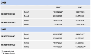 The school year is divided into four terms of 10 weeks each, with school holiday periods of two weeks between each term. These holidays occur in April, July and late September to early October.